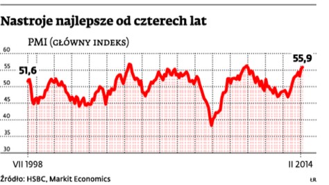 Główny indeks PMI wzrósł w lutym do 55,9 pkt. To zaskoczenie, ponieważ ekonomiści spodziewali się raczej lekkiego spadku po styczniowych wzrostach. Tymczasem mamy czwarty co do wielkości poziom w historii badań (prowadzone są od lipca 1998 r.). W lutym PMI był najwyższy od listopada 2010 r.
