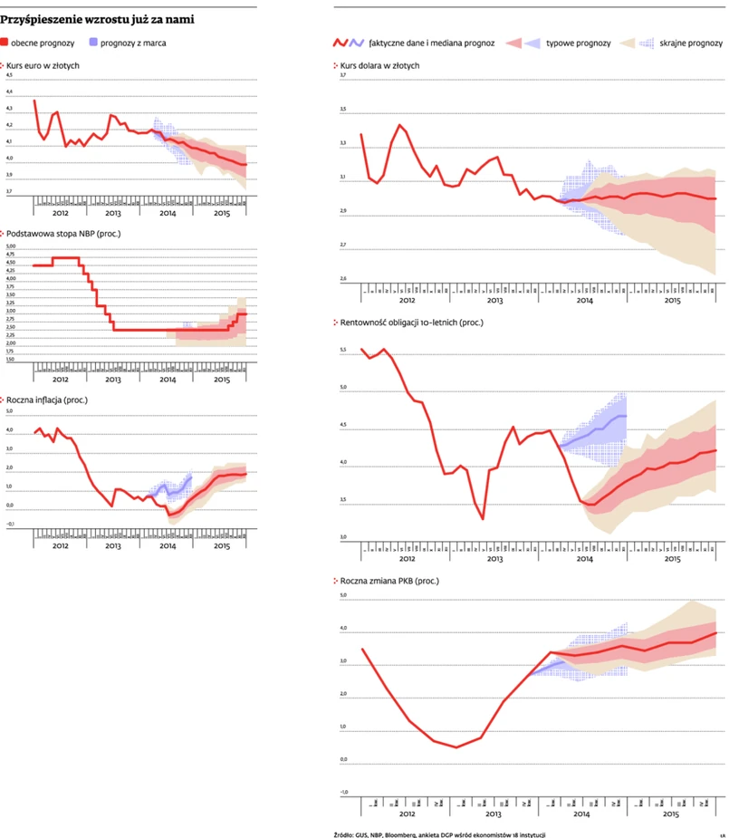 polityki pieniężnej – pod koniec 2015 r. główna stopa NBP osiągnie 3 proc. (obecnie jest o 0,5 pkt proc. niższa). Szybciej będzie natomiast rosła rentowność obligacji. Dochodowość papierów 10-letnich, która obecnie wynosi ok. 3,5 proc., wiosną przyszłego roku zbliży się do 4 proc., a pod koniec 2015 r. będzie przekraczać 4,2 proc. Dla obligacji dwuletnich prognozowany jest wzrost rentowności z 2,5 proc. obecnie do 3,3 proc. w końcu przyszłego roku.