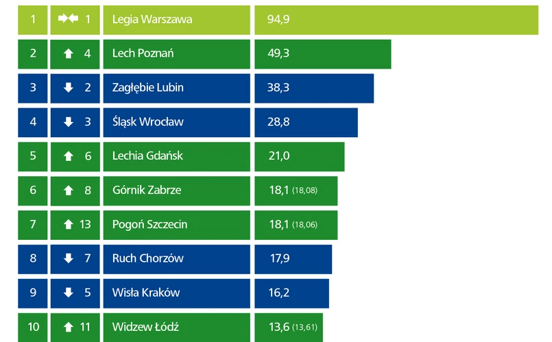 Legia Warszawa tegoroczne zdecydowane zwycięstwo zawdzięcza zwiększeniu przychodów o 28,5 mln zł, co stanowi wzrost o 43 proc. rok do roku. „Po raz trzeci w naszym zestawieniu warszawski klub jest niezaprzeczalnym liderem. Dodatkowo, wraz ze zdobyciem mistrzostwa w sezonie 2013/2014, drużyna kolejny raz stoi przed szansą awansu do Ligi Mistrzów UEFA. Gdyby udało jej się przejść do fazy grupowej tych prestiżowych europejskich rozgrywek, mogłaby zostać pierwszym polskim zespołem, który osiągnął przychody na poziomie przekraczającym 100 mln zł rocznie. Jednocześnie na długo zdystansowałaby pozostałych krajowych rywali pod względem przychodów” – mówi Marcin Diakonowicz, Partner w Dziale Audytu, Lider Sports Business Group Poland, Deloitte.