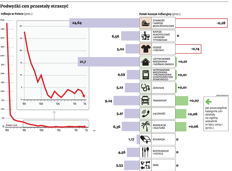 To, co się dziś dzieje z cenami w Polsce, nie wypełnia definicji deflacji. Z pewnością daleko nam do tak dużych kłopotów, jakie ma Japonia. Spadek cen u nas nie jest ani ogólny, ani tym bardziej długotrwały (trwa raptem miesiąc). Dane GUS pokazują jasno, że ledwie dwie kategorie towarów ściągają inflację w dół. Najważniejsza to ceny żywności: w lipcu obniżały wskaźnik o 0,28 pkt proc. Co nie dziwi, bo wydatki na żywność to około 24,6 proc. wszystkich wydatków konsumenckich.
