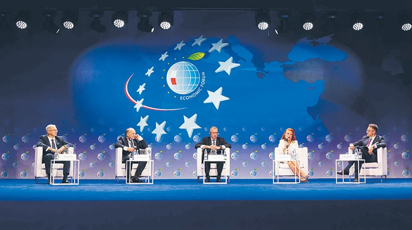 Uczestnicy: Jerzy Kwieciński, wiceprezes Pekao SA, Zygmunt Berdychowski, przewodniczący Rady Programowej Forum Ekonomicznego (moderator), David Anderson, wiceprezes BP, Georgette Mosbacher, była ambasador USA w Polsce, Włodzimierz Wlaźlak, prezes Lidl Polska / foto: materiały prasowe