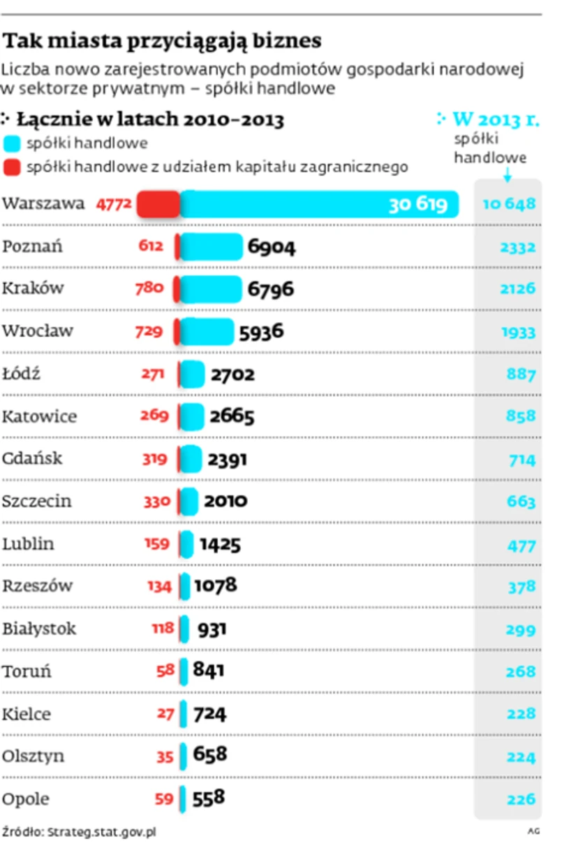 Stolica całkowicie zdystansowała konkurencję. W latach 2010–2013 powstało na jej terenie ponad 30,6 tys. nowych spółek. To ponad czterokrotnie więcej niż w następnym w kolejności Poznaniu. Podobna sytuacja jest w przypadku firm z udziałem kapitału zagranicznego. W analogicznym okresie w Warszawie powstało ich niemal 4,8 tys. Na drugim miejscu jest Kraków – z wynikiem zaledwie 780 nowych spółek. Jeszcze mniej mają Wrocław i Poznań.