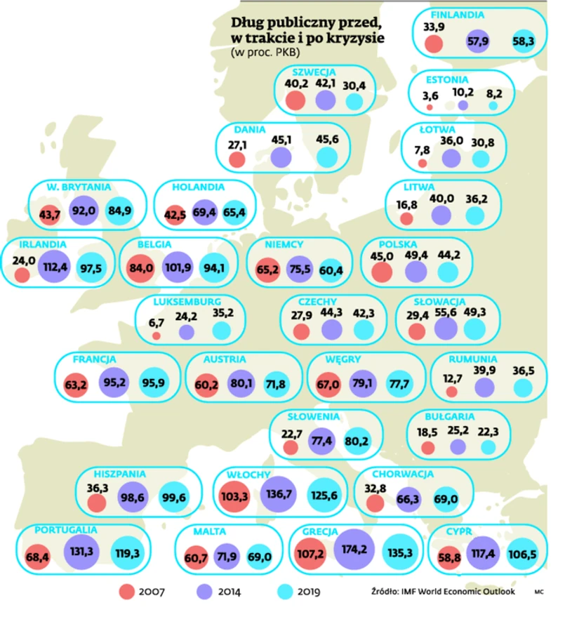 O ile jednak w kwestii redukowania deficytów budżetowych większość państw Unii notuje postępy, o tyle z ograniczaniem długu publicznego idzie już gorzej. We wszystkich 28 państwach UE dług publiczny liczony jako odsetek PKB jest dziś wyższy niż w roku 2007 r., czyli ostatnim przed wybuchem światowego kryzysu, przy czym w 11 jest on wyższy co najmniej dwa razy. W 2007 r. dług publiczny mieszczący się poniżej dopuszczalnej przez Komisję Europejską granicy 60 proc. PKB miało 19 państw członkowskich, a dwa kolejne przekraczały ten poziom tylko nieznacznie. Jedynie dwa kraje miały dług publiczny przekraczający 100 proc. ich PKB, za to w trzech był on na poziomie jednocyfrowym. W bieżącym roku, według najnowszej prognozy Międzynarodowego Funduszu Walutowego, wartości poniżej 10 proc. nie osiągnie nikt, za to krajów z zadłużeniem ponad 100 proc. będzie już sześć. Liczba krajów mieszczących się w pułapie 60 proc. spadła do 12, czyli są już one w mniejszości.