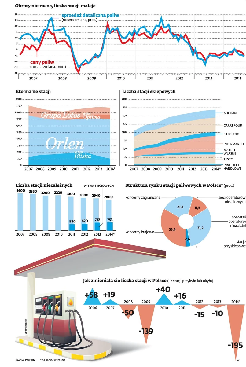 W tym roku skurczyły się sieci dwóch polskich koncernów paliwowych: Orlen – jak podaje POPiHN – miał na koniec września 1757 stacji, o ponad 20 mniej niż trzy kwartały wcześniej, zaś sieć Grupy Lotos liczy 432 placówki (o siedem mniej niż pod koniec 2013 r.). Szczególnie w przypadku firmy z Płocka to wynik zamknięcia na początku roku tych stacji, które nie spełniały nowych norm środowiskowych.