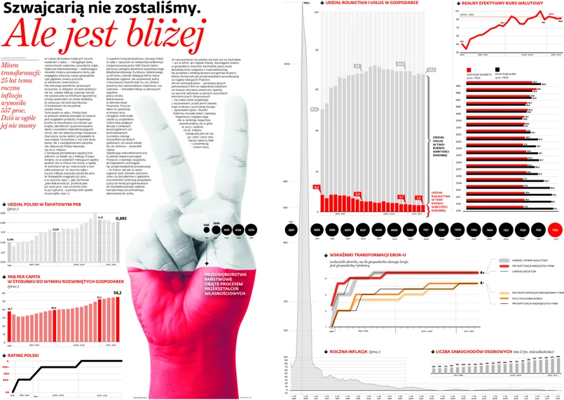 W rzeczywistości tej wiedzy nie było też na Zachodzie – ani w MFW, ani nigdzie indziej. Wymagane zmiany w gospodarce znacznie wychodziły poza nasze doświadczenie związane z makroekonomią. Na przykład z Wielkiej Brytanii przyjechali eksperci, którzy tłumaczyli, jak przeprowadzano prywatyzację za rządów Margaret Thatcher. Ale ich doświadczenie – sprzedaży dużych państwowych firm w najbardziej stabilnym na świecie otoczeniu prawnym, opartej na wycenie aktywów w jasnych warunkach ekonomicznych i finansowych – nie miało wiele wspólnego z wyzwaniami, przed jakimi stawały kraje środkowo-wschodniej Europy – opowiadał Lipton. Skutek? Reformy musiały boleć i zabolały. Popełniono niejeden błąd. Ale w rankingu bogactwa powoli pniemy się w górę. W 2013 r. byliśmy na 56. miejscu. Szwajcaria jest od nas już „tylko” sześć razy lepsza (obecny lider – Luksemburg – osiem razy).