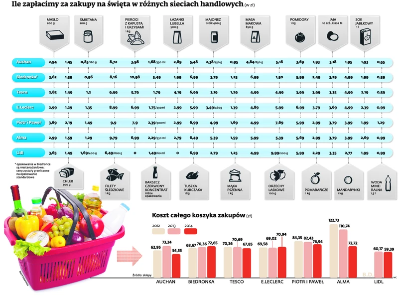 Z naszego zestawienia wynika też, że na skutek obniżek ceny w poszczególnych sieciach uległy spłaszczeniu w stosunku do 2013 r. Za standardowy koszyk przyjdzie nam zapłacić ok. 70 zł. Wyjątkiem jest Auchan, gdzie zapłacimy za niego niecałe 55 zł. Eksperci tłumaczą to tym, że ta sieć musi coraz bardziej zabiegać o klientów. Jej sklepy zlokalizowane są w większości na obrzeżach aglomeracji, tymczasem jej konkurenci mają coraz więcej punktów na osiedlach mieszkaniowych i w centrach miast.