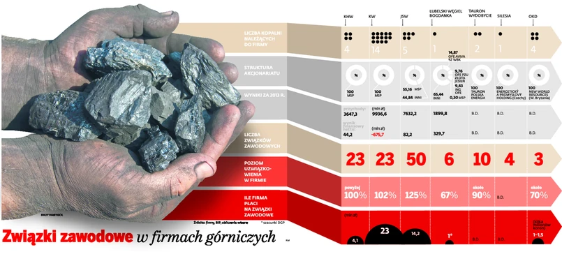 związki zawodowe, są znacznie większe niż w najbogatszej polskiej firmie, jaką jest KGHM. W Lubinie na działalność organizacji związkowych z budżetu koncernu przekazano 9,8 mln zł.