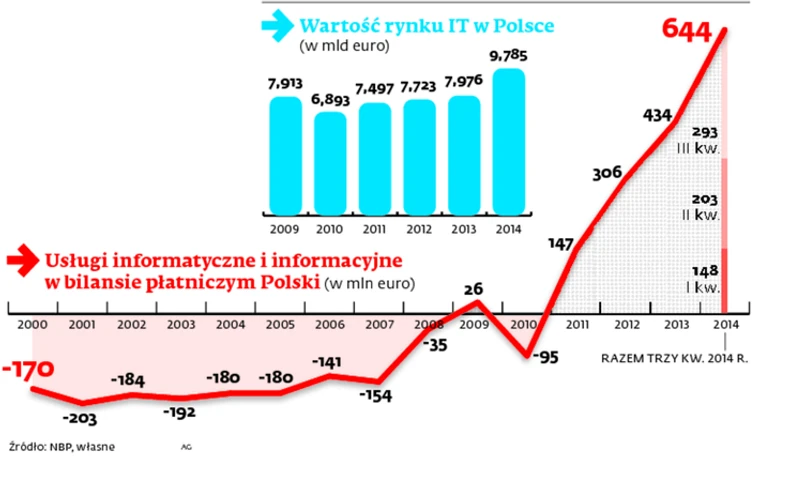 W Polsce rynek IT w 2015 r. ma być wart prawie 12 mld dol., to ok. 8 proc. więcej niż przed rokiem. Dynamicznie rośnie także eksport polskich firm informatycznych. Według NBP w trzech kwartałach 2014 r. wyniósł on prawie 850 mln dol.