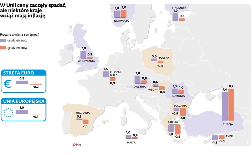 Jak się okazuje, w grudniu niższe niż rok wcześniej były ceny 40 spośród ponad 90 grup, dla których publikowane są dane. Największy, 15,4-proc. spadek zanotowano w kategorii „naprawa sprzętu sportowego”. Niewiele mniej, bo o 13,1 proc., spadły ceny w pralniach. Te usługi mają niewielki udział w naszym koszyku konsumpcyjnym. Do spadku poziomu cen w większym stopniu przy- czyniły się taniejący chleb (w grudniu kosztował o 8,7 proc. mniej niż rok wcześniej) czy mięso (spadek o 7,8 proc.). Ale nie wszystko taniało. O 11 proc. podrożały usługi związane ze sportem i rekreacją, a o 7,3 proc. – usługi pocztowe.