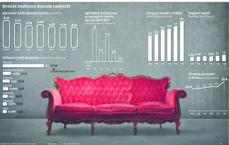 W sumie w ubiegłym roku eksport mebli z Polski zwiększył się o 14 proc. i wyniósł 8,1 mld euro. Najważniejsze są Niemcy, gdzie trafia 38 proc. naszego eksportu mebli. Do tego kraju w ubiegłym roku wysłane zostały meble o wartości 3,1 mld euro wobec 2,7 mld euro rok wcześniej. Na drugim miejscu jest Wielka Brytania z udziałem na poziomie 7,7 proc., a na trzecim Francja – 6,4 proc. Do Wielkiej Brytanii w 2014 r. wysłano towary za 623 mln euro, podczas gdy w 2013 r. było to 525 mln euro. W przypadku Francji był wzrost z 497 mln euro w 2013 r. do 520 mln euro rok później. W pierwszej piątce mieszczą się jeszcze Czechy i Holandia.