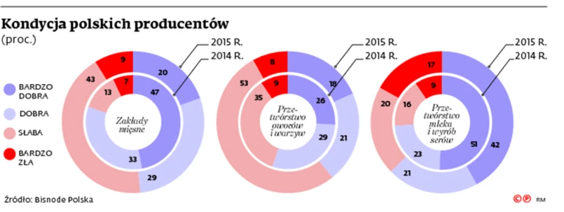 Niekorzystnie przedstawia się również sytuacja przetwórców owoców i warzyw. Złą i bardzo złą kondycję finansową deklaruje o 16 pkt proc. więcej firm niż rok temu. 11-punktowy wzrost tego odsetka odnotowano z kolei w sektorze producentów serów i przetwórstwa mlecznego. – Warto podkreślić, że w ostatnim roku w sektorze mleczarskim liczba firm w bardzo złej kondycji finansowej wzrosła o 7,3 pkt proc., z 9,4 proc. w kwietniu 2014 r., do ponad 16,7 proc. w 2015 r. – mówi Tomasz Starzyk.