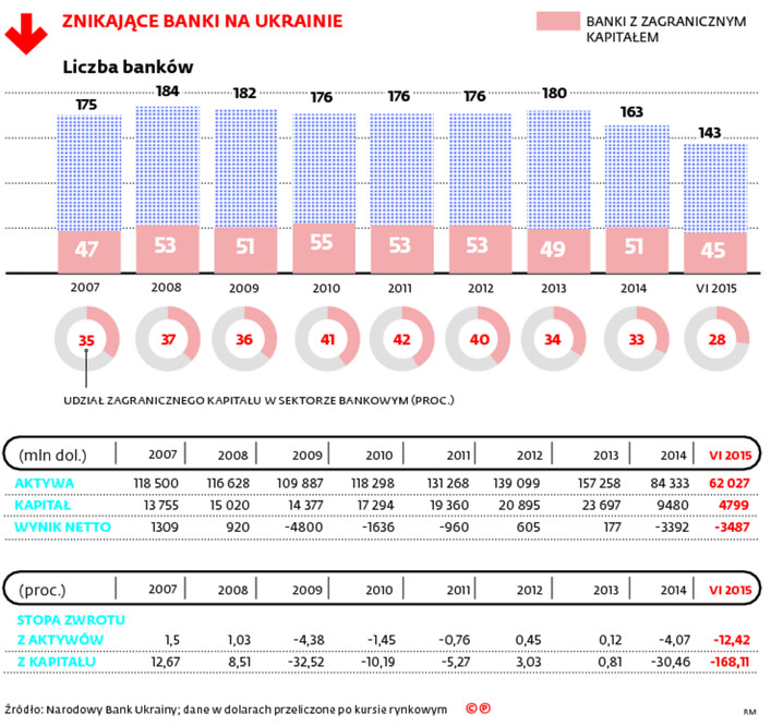 Faktycznie, szanse na podpisanie ustawy przez prezydenta Poroszenkę nie są duże. – Populistyczni politycy stworzyli zagrożenie dla egzystencji systemu bankowego po to, by zdobyć trochę poparcia – skomentował przyjęcie ustawy. Przepisy skrytykowały resort finansów i bank centralny. Przewalutowanie kredytów mogłoby się bowiem okazać gwoździem do trumny ukraińskich banków. Przed kryzysem zachodnie grupy finansowe prześcigały się w przejmowaniu instytucji na – jak się wówczas zdawało – perspektywicznym rynku. Kilka lat kryzysu i konflikt z Rosją o wschodnią część kraju odwróciły sytuację o 180 stopni. W porównaniu z końcem 2007 r. liczba banków zmniejszyła się o niemal jedną piątą. Kapitały w przeliczeniu na dolary skurczyły się o niemal dwie trzecie (w przeliczeniu na hrywnę są wyższe niż osiem lat temu, ale ze względu na duże straty banków – o połowę mniejsze niż w końcu 2013 r.). Jedna piąta należności banków to złe kredyty.