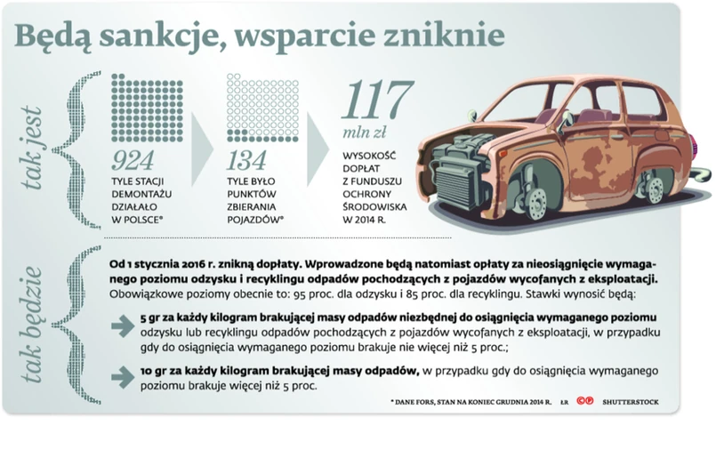 Prowadzący legalny demontaż uważają, że nałożenie kar wyłącznie na nich jest wręcz niezgodne z dyrektywą PE i Rady 2000/53/WE z 18 września 2000 r. w sprawie pojazdów wycofanych z eksploatacji (Dz.Urz. WE z 2000 r. L 269, s. 34), która mówi, że za osiągnięcie poziomów odzysku i recyklingu odpowiadają m.in. producenci, ubezpieczyciele czy dilerzy pojazdów. – W Polsce zaś wyłączną odpowiedzialność będą ponosić przedsiębiorcy prowadzący stacje demontażu – mówi Adam Małyszko. A przecież zależy to też od pracy innych ogniw systemu odzysku i recyklingu.