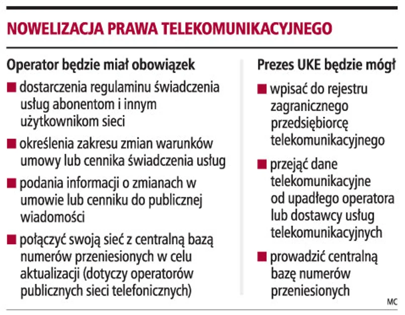 Rząd przyjął wczoraj projekt nowelizacji prawa telekomunikacyjnego (Dz.U. nr 171, poz. 1800 z późn. zm.), który przewiduje możliwość wpisania do rejestru przedsiębiorcy telekomunikacyjnego nieposiadającego siedziby na terytorium RP. Ministerstwo Infrastruktury, które przygotowało nowe rozwiązania, proponuje, aby dane telekomunikacyjne upadłego operatora lub dostawcy usług telekomunikacyjnych przejmował prezes Urzędu Komunikacji Elektronicznej.