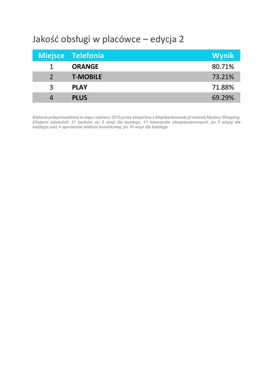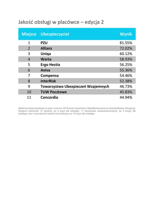 Na przełomie maja i czerwca eksperci z portalu MojeBankowanie.pl po raz drugi zbadali jakość obsługi w placówkach i punktach obsługi 11 firm ubezpieczeniowych, 21 banków i 4 operatorów telefonii komórkowej.