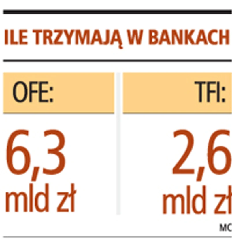 Z danych Komisji wynika, że udział depozytów bankowych w aktywach krajowych otwartych funduszy inwestycyjnych jest niewielki. Ich sprawozdania wskazują, że środki pieniężne i depozyty stanowią poniżej 3 proc. aktywów otwartych funduszy, przy czym depozyty stanowią mniejszą część tej wartości. Na koniec września wartość aktywów krajowych TFI wynosiła 86,51 mld zł. To oznacza, że w ten sposób fundusze mogły ulokować łącznie poniżej 2,6 mld zł. Tak jak w przypadku funduszy emerytalnych ochronie nie podlegają natomiast depozyty założone przez fundusze inwestycyjne w bankach innych niż depozytariusz. Jednak po danych KNF widać, że TFI rzadko decydują się na ich zakładanie. A jeśli do tego dochodzi, otwierają je zwykle w banku depozytariuszu. W innych bankach wykorzystują najczęściej transakcję buy/sell back. Polega ona na kupnie od banku i późniejszym odkupie papierów wartościowych. Transakcje obejmują głównie bezpieczne bony i obligacje skarbowe.