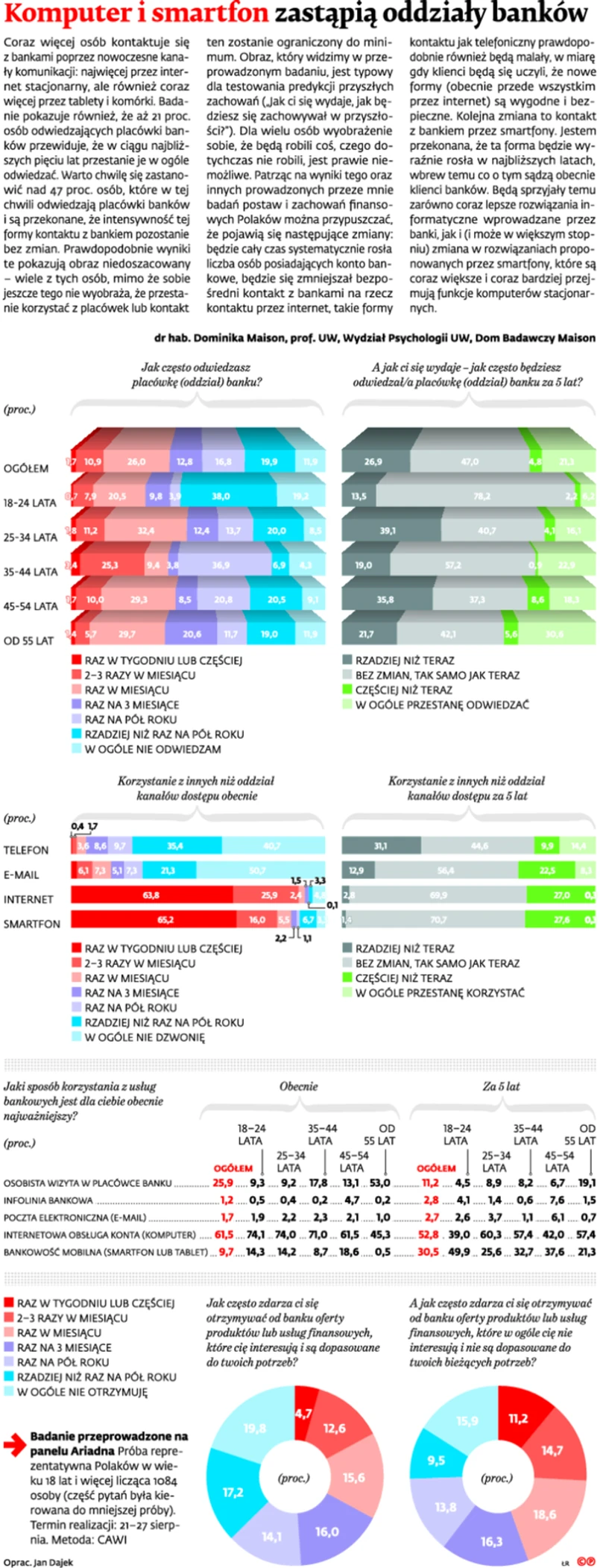 banków. My jako bankowcy uważamy, że przejście do bankowości internetowej i mobilnej będzie nawet szybsze i że oddziały będą w coraz mniejszym stopniu potrzebne. Ale trzeba klientów podzielić na grupy. Są różne pokolenia: mamy klientów, którzy weszli w dorosłość przed internetem, nowoczesnymi rozwiązaniami technologicznymi. Tam proste rozwiązania – oddział, internet – są bardziej preferowane. Wśród młodych ludzi na pewno jest większe oczekiwanie bankowości mobilnej.
