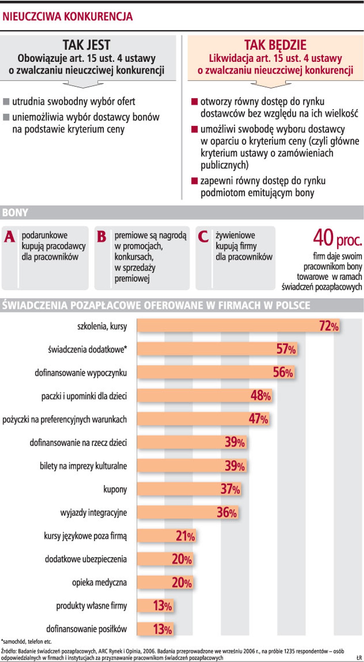 - Z powodu wadliwej nowelizacji ustawy o zwalczaniu nieuczciwej konkurencji i wprowadzeniu do niej przepisu art. 15 ust. 4 rynek bonów został zmonopolizowany przez jedną dużą firmę Sodexho Pass Polska, która wyrugowała mniejsze. Oferowały one bony do ówczesnych placówek handlu detalicznego i zbudowały sieć sprzedaży opartą o dużą liczbę miejsc akceptacji oferowanych bonów.