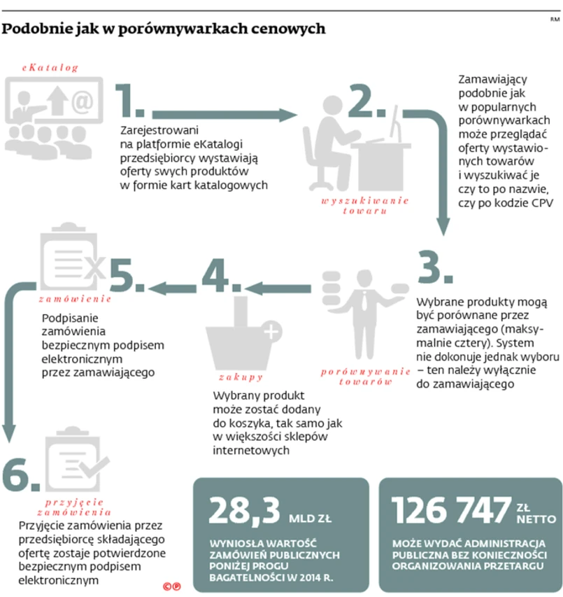 Elektroniczna Platforma Katalogów Produktów – e-Katalogi, bo taka jest pełna nazwa serwisu, to coś w rodzaju porównywarki cenowej dla administracji publicznej. Jeśli wartość zakupu nie przekracza progu bagatelności, a więc 30 tys. euro netto, to za jej pośrednictwem można znaleźć interesującą ofertę i zawrzeć umowę.