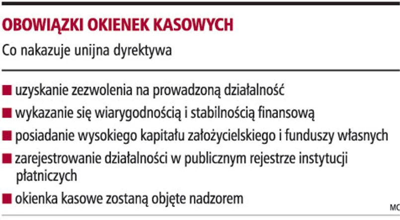 Okienka kasowe zostaną zobowiązane do zarejestrowania się w publicznym rejestrze instytucji płatniczych. Aby je prowadzić, trzeba też będzie uzyskać specjalne zezwolenie i posiadać wysoki kapitał założycielski. Mają też przesyłać przyjęte od klienta pieniądze na rachunek adresata już następnego dnia po przyjęciu zlecenia. Takie obowiązki na okienka kasowe nakłada unijna dyrektywa o usługach płatniczych.