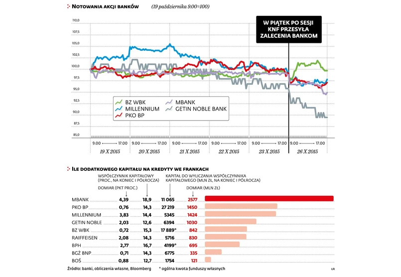 W ostatni piątek nadzór wysłał zalecenia dotyczące dodatkowych wymogów kapitałowych do 14 banków. Policzyliśmy, co to oznacza dla dziewięciu banków, których akcje lub obligacje są notowane na warszawskiej giełdzie. Kwota „domiarów”, czyli dodatkowego wymogu kapitałowego określonego przez nadzór, odpowiada z grubsza szacunkom kosztów przewalutowania kredytów we frankach, jakie banki poniosłyby, gdyby w pierwotnym kształcie zaczęła obowiązywać ustawa przygotowana niedługo przed wyborami przez Platformę Obywatelską. W przypadku przewalutowania chodziło jednak o koszty związane z całą operacją. „Domiar” oznacza, że bank musi mieć odpowiednio więcej kapitału na zabezpieczenie strat związanych z kredytami tak, by spełniać minimalne wymogi nałożone przez KNF.