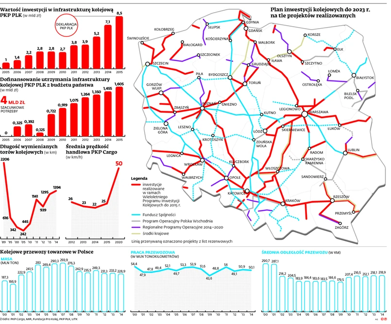 W sumie PLK mają wydać na inwestycje do 2023 r. 67 mld zł. W porównaniu z ubiegłą perspektywą kwotowo to duży krok do przodu, który daje szanse na wydobycie transportu kolejowego z dołka. Z drugiej strony, na drogi krajowe dla GDDKiA trafi w tym samym czasie 107 mld zł. Przeznaczona na kolej kwota nie wystarczy do zaspokojenia inwestycyjnych potrzeb, bo do pilnej wymiany albo bieżących napraw kwalifikuje się jedna czwarta istniejącej sieci.