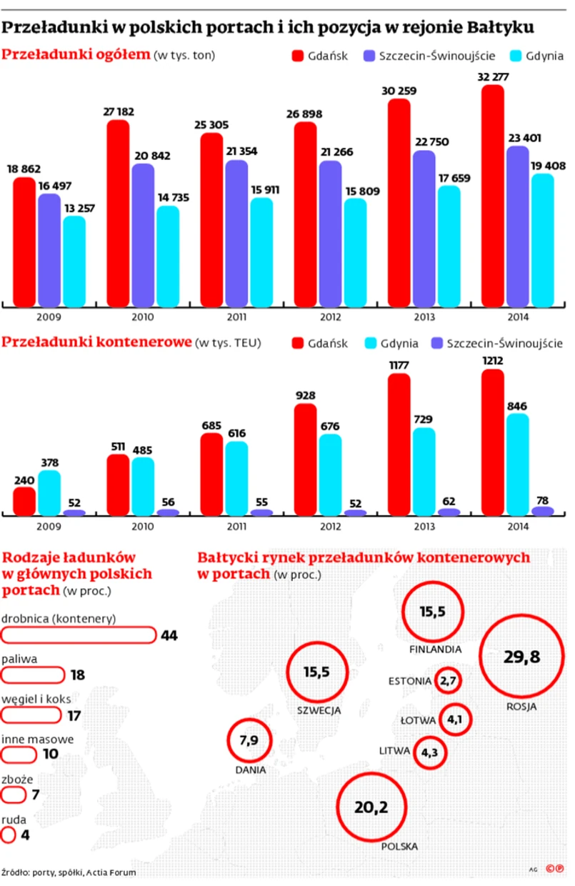 Cztery główne polskie porty morskie – Gdańsk, Gdynia, Szczecin i Świnoujście – mogą pochwalić się stabilną kondycją finansową. Gdańsk już dziś pełni rolę regionalnego hubu, skąd rozwożone są lądem i morzem do innych ładunki, które przypływają w kontenerach z Dalekiego Wschodu. Jest też drugim pod względem przeładunków portem na Bałtyku – po Sankt-Petersburgu. W swoich strategiach zarządy tych czterech portów zakładają podwojenie wielkości przeładunków w ciągu najbliższych 12 lat. W unijnej perspektywie 2014–2020, która będzie rozliczana do 2023 r., chcą wydać na inwestycje łącznie ponad 2,2 mld zł.