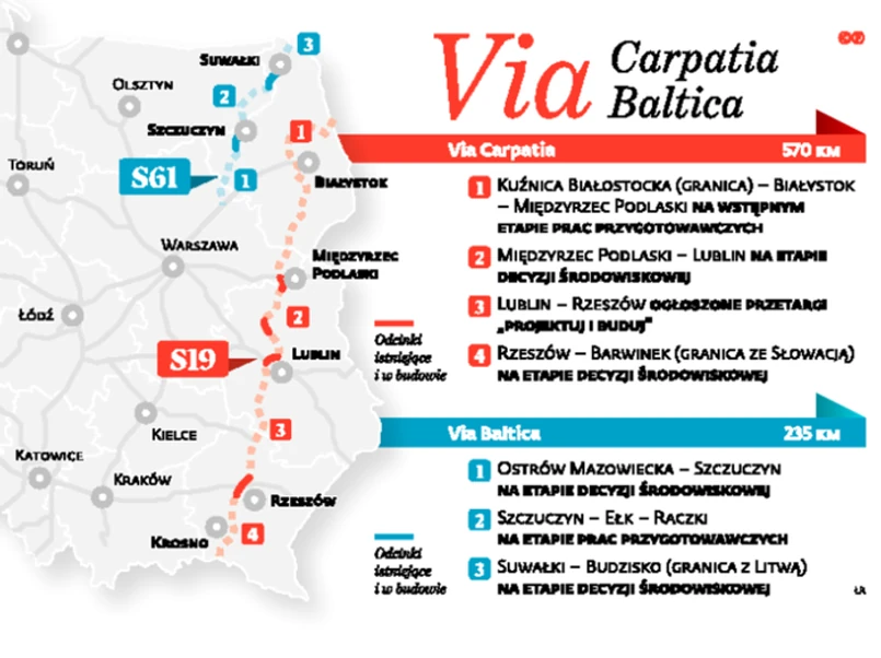 Zielone światło zapali się też dla Via Baltica, dla której paliwem ma być instrument finansowy CEF „Łącząc Europę”. To trasa S61 między Ostrowią Mazowiecką a granicą z Litwą (po drugiej stronie ma się połączyć z A5 prowadzącą przez Kowno do Rygi). Dla odcinków z Ostrowi do budowanej obwodnicy Szczuczyna i z Suwałk do granicy GDDKiA ma decyzje środowiskowe. Dla fragmentu od Szczuczyna do Ełku prace są na etapie opracowywania dokumentów do wniosku o decyzję.