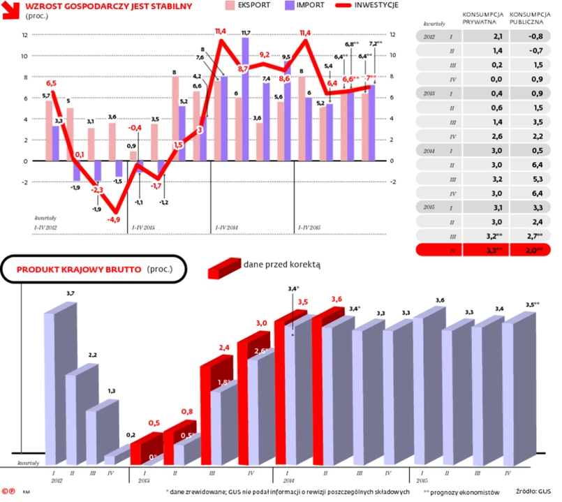 PiS obejmuje władzę, gdy gospodarka stabilnie rośnie. Ekonomiści przestrzegają, że łatwo to zepsuć. W III kw. polski PKB rósł o 3,4 proc. Wynik nieco lepszy niż kwartał wcześniej wskazuje na rosnący popyt wewnętrzny, głównie za sprawą konsumpcji napędzanej poprawą na rynku pracy.