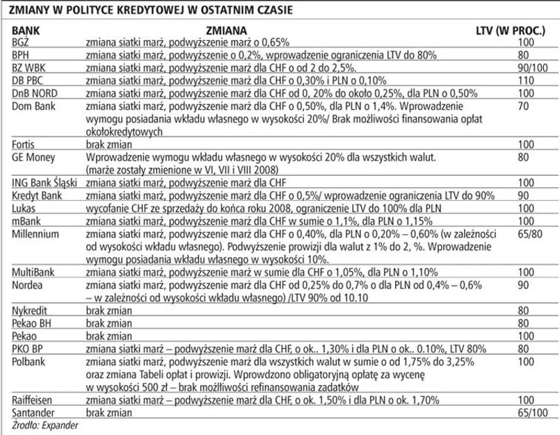 Marże i prowizje bankowe szybciej rosną w wypadku kredytów walutowych, choć także osoby zadłużone w złotych odczuwają wzrost prowizji bankowych. Kredytobiorcy odczuwają też wzrost cen pieniądza na rynku międzybankowym. W niektórych bankach do tej pory udzielających kredytów walutowych zastosowano niemal zaporowe wskaźniki LTV, czyli bardzo duży udział własny kredytobiorcy w finansowaniu zakupu nieruchomości.