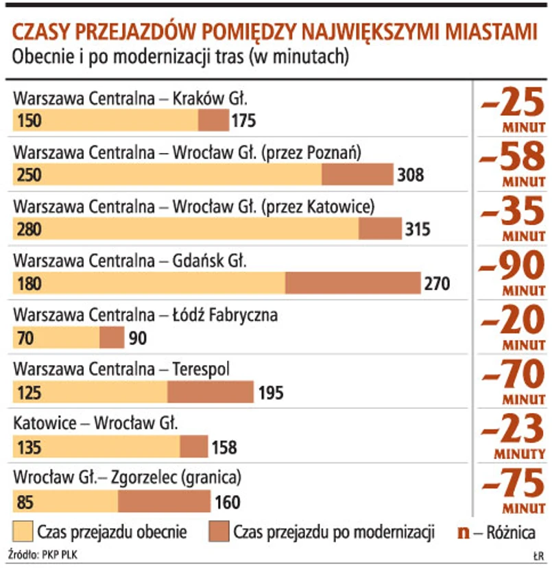 Podróż koleją ze stolicy nad Bałtyk zajmuje 4,5 godz., a do Wrocławia ponad 5 godz. Na przejechanie zaledwie 177 km z Katowic do Wrocławia PKP potrzebują aż 2 godz. 38 min, czyli tyle, ile ze Śląska do stolicy na dystansie niemal dwa razy dłuższym. Za cztery lata ma się to zmienić.