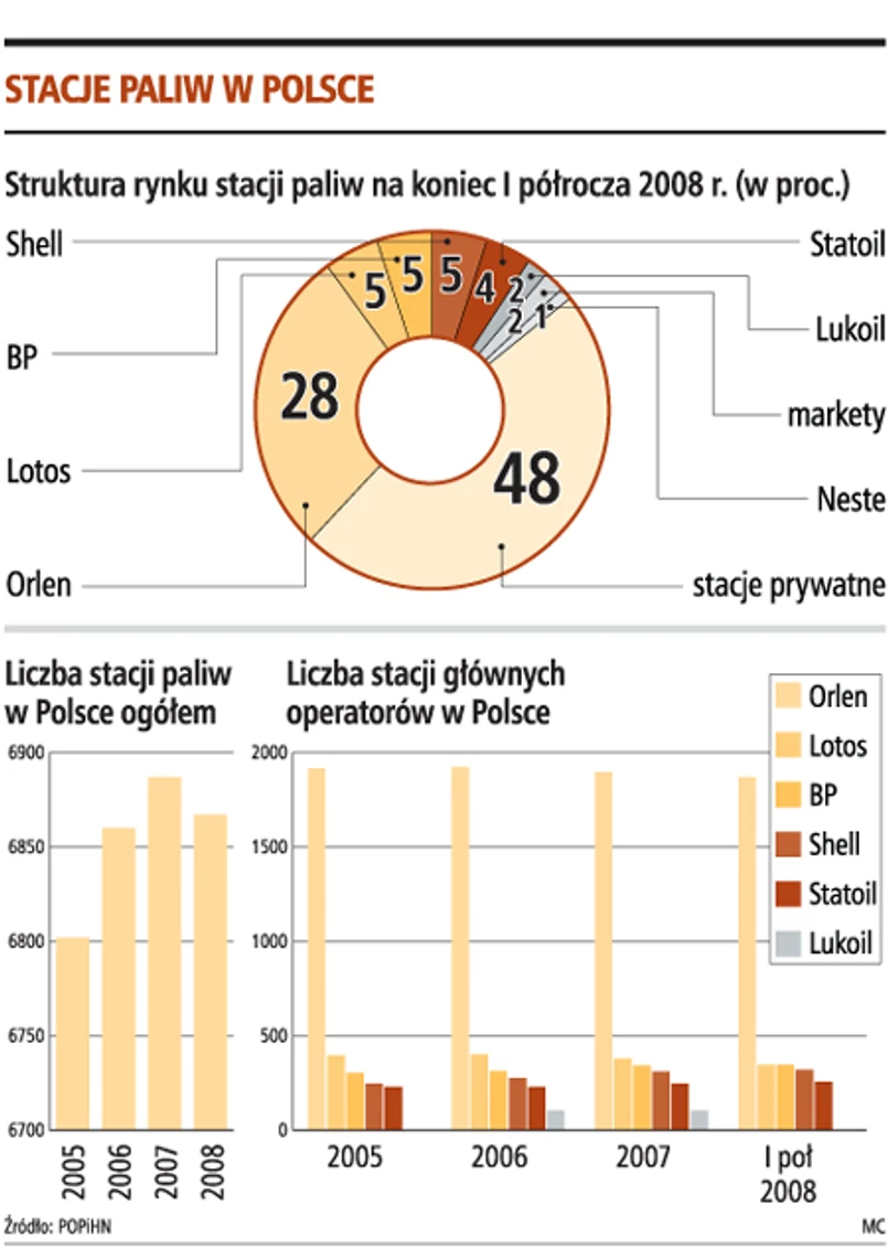 Liderem w Polsce pod względem wielkości sieci, mimo 0,5-proc. spadku liczby stacji na przestrzeni I półrocza, jest niezmiennie PKN Orlen. Największym wygranym pierwszych sześciu miesięcy jest jednak koncern BP. Po uruchomieniu kolejnych stacji partnerskich sieć ta na koniec czerwca liczyła łącznie 350 stacji i tym samym wyprzedziła Lotos (345 stacji).