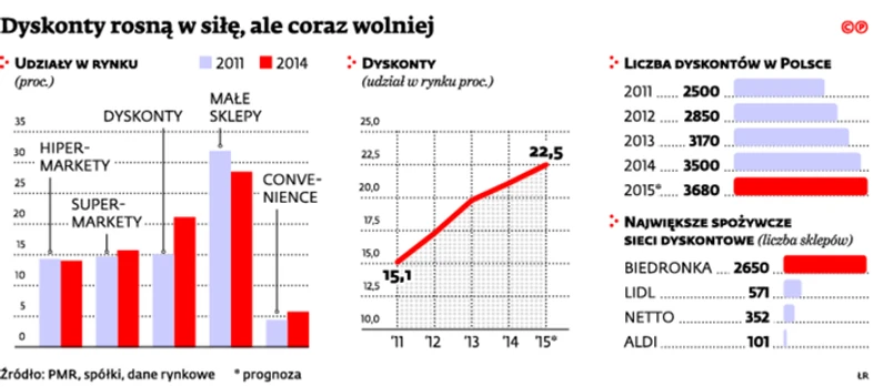 Jak wynika z deklaracji sieci dyskontowych, w tym roku otworzą one zaledwie 150–160 sklepów. To o połowę mniej niż przed rokiem. Wolniejsza ekspansja dyskontów przekłada się na spadek tempa wzrostu ich udziałów w rynku detalicznym. Jak prognozuje PMR, na koniec roku wyniosą one 22,5 proc., czyli będą o 1,4 pkt proc. większe niż w 2014 r. Niedawno udziały dyskontów rosły o ponad 2 pkt proc. rocznie.