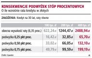 Podwyżka o 25 pkt bazowych przy kredycie w kwocie 200 tys. zł, rozłożonym na 30 lat, to wzrost miesięcznej raty o 33 zł, a przy większym kredycie w wysokości 400 tys. zł będzie to różnica 65 zł. Jeśli zmaterializuje się najbardziej prawdopodobny scenariusz i RPP podniesie jeszcze stopy łącznie o 0,75 pkt proc., to wzrost raty przy kredycie w kwocie 200 tys. zł wyniesie łącznie 99 zł, a jeśli ktoś pożyczył na zakup nieruchomości 400 tys. zł, to jego rata zwiększy się o 200 zł.