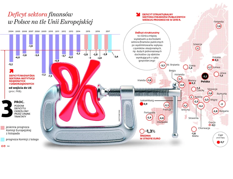 Przed resortem trudne zadanie, by przekonać Brukselę o realności planów na 2017 r. Bo o ile prognozy Komisji i naszego rządu dotyczące deficytu SFP w 2016 r. są zgodne, o tyle rozjeżdżają się w ocenie kolejnego roku. Komisja Europejska prognozuje, że różnica między dochodami a wydatkami sektora finansów publicznych wyniesie 3,4 pkt proc. PKB, czyli 0,4 pkt proc. PKB przekroczy barierę deficytu wynikającą z kryteriów z Maastricht. Taka różnica to w warunkach przyszłorocznego wzrostu gospodarczego 7,5 mld zł.