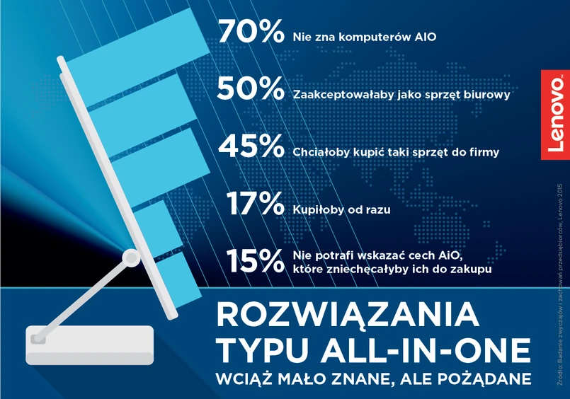 Łukasz Rutkowski, DT&WS Business Development Manager SMB Lenovo, tak komentuje wyniki badania Lenovo: Warto w ¬rozmowach z¬ użytkownikami podkreślać, że rozbudowa AiO, o¬ którą tak często się obawiają jest dużo łatwiejsza niż w ¬przypadku notebooka. Na rynku dostępne jest nowatorskie rozwiązanie Tiny in One, z możliwością wymiany całej jednostki obliczeniowej. Dzięki temu możemy w ciągu minuty całkowicie zmienić wydajność i porty rozwiązania typu All in One lub zainstalować nowy monitor, pozostawiając jednostkę obliczeniową. Kolejną obawą, którą zgłaszają nam klienci, dotyczy serwisu sprzętu. W odpowiedzi na potrzeby klientów Lenovo wprowadziło ofertę rozszerzonej gwarancji, która polega na zagwarantowaniu użytkownikowi końcowemu naprawy w następnym dniu roboczym, w miejscu instalacji sprzętu. W momencie, gdy dziś ulegnie uszkodzeniu któryś z komponentów komputera i zgłosimy to do serwisu, już kolejnego dnia roboczego możemy liczyć na naprawę, która musi zakończyć się sukcesem.