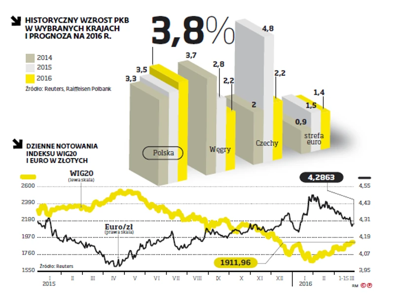 Motorem wzrostu pozostaje konsumpcja, która zyska dodatkowe wsparcie po uruchomieniu programu dopłat na dzieci 500 plus. Z tego też względu w ostatnich miesiącach kilka in-stytucji (w tym także Raiffeisen) podnosiło swoje prognozy wzrostu PKB. Prognozy banku zakładają, że wzrost w 2016 r. może sięgnąć nawet 3,8 proc. (licząc rok do roku) wobec 3,6 proc. w poprzednim, co ponownie stawia polski rynek w lepszym świetle na tle wątłego wzrostu w strefie euro czy wyhamowującej dynamiki PKB Węgier oraz Czech (która w 2016 r. prawdopodobnie uplasuje się niewiele powyżej 2 proc. w obu przypadkach).