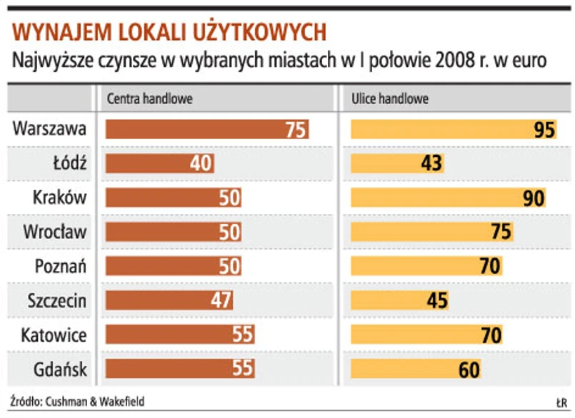 - W warszawskich centrach handlowych obowiązują najwyższe czynsze: 65-75 euro za mkw. W dużych miastach to 40-55 euro za mkw. - informuje Katarzyna Michnikowska, starszy analityk działu doradztwa Cushman & Wakefield.