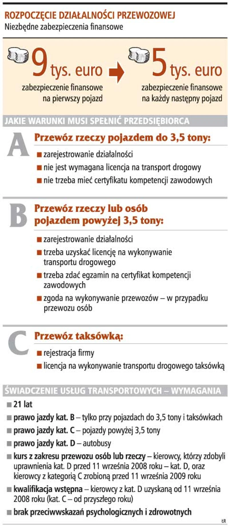 Mając odpowiednią sytuację finansową, pojazd i uprawnienia - kategoria prawa jazdy adekwatna dla danego rodzaju pojazdu, którym będą świadczone usługi oraz certyfikat kompetencji zawodowych, można ubiegać się o przyznanie licencji transportowej. Należy się zgłosić do starosty właściwego ze względu na miejsce siedziby firmy, jeżeli usługi będą świadczone tylko na terenie kraju. Jeżeli ktoś postanowi jednak starać się o licencję na międzynarodowy transport, musi się zgłosić do ministerstwa właściwego do spraw transportu (obecnie Ministerstwo Infrastruktury).