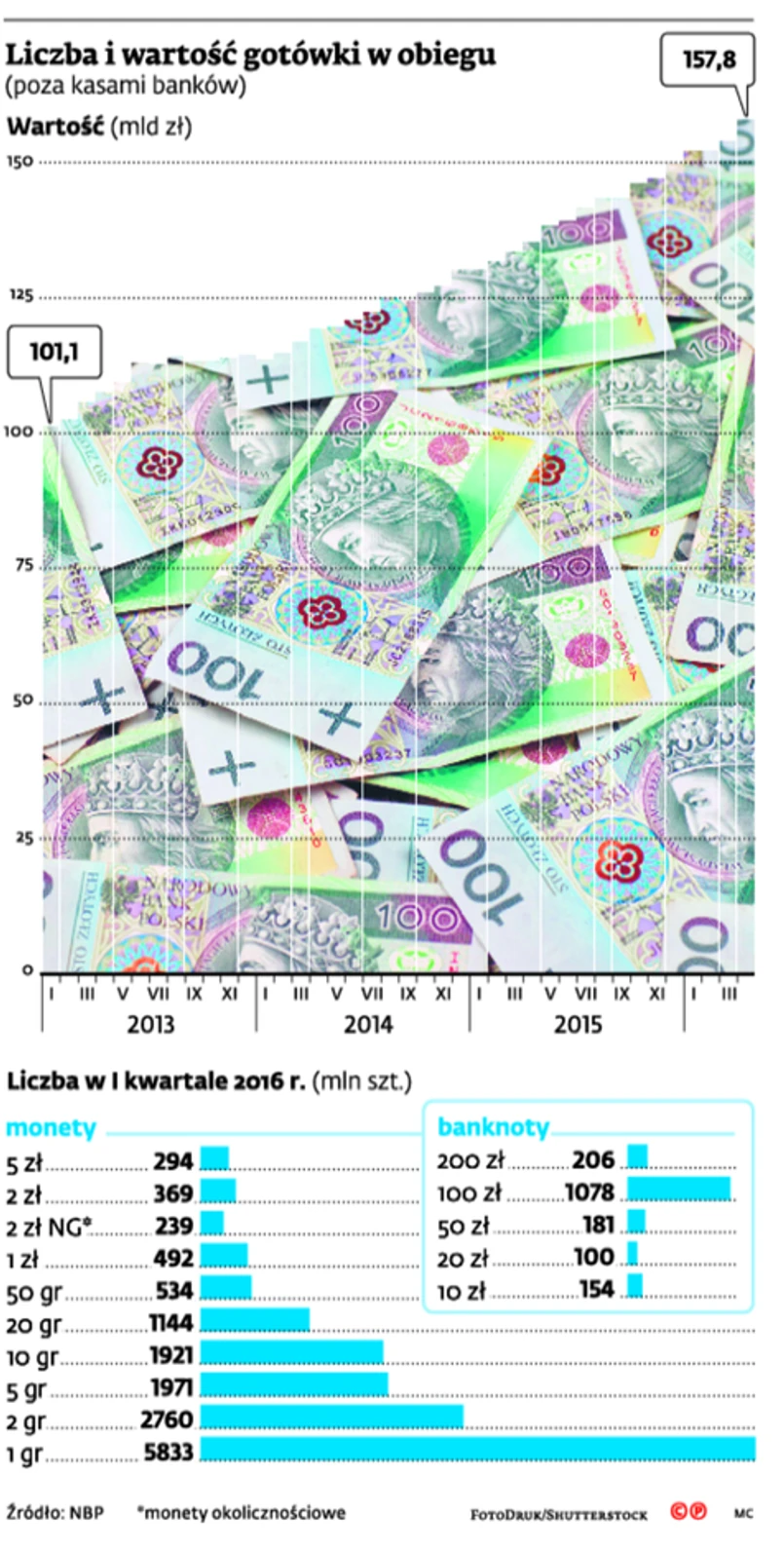 Prawie 158 mld zł krąży w gospodarce w postaci banknotów i monet. To dane Narodowego Banku Polskiego. Kwota nie uwzględnia tego, co banki trzymają w swoich kasach, dotyczy gotówki w obiegu używanej do codziennych płatności i rozliczeń, ale też tej, którą Polacy trzymają „w skarpecie”. Wzrost wartości gotówki w obiegu wynosił w kwietniu prawie 17 proc. rok do roku. Tak dużej dynamiki wzrostu nie notowano od początku 2009 r. Wtedy miało to związek ze spieniężaniem inwestycji, czyli np. wypłacaniem lokat z banków czy wycofywaniem się z funduszy inwestycyjnych ze strachu przed negatywnymi skutkami kryzysu finansowego.