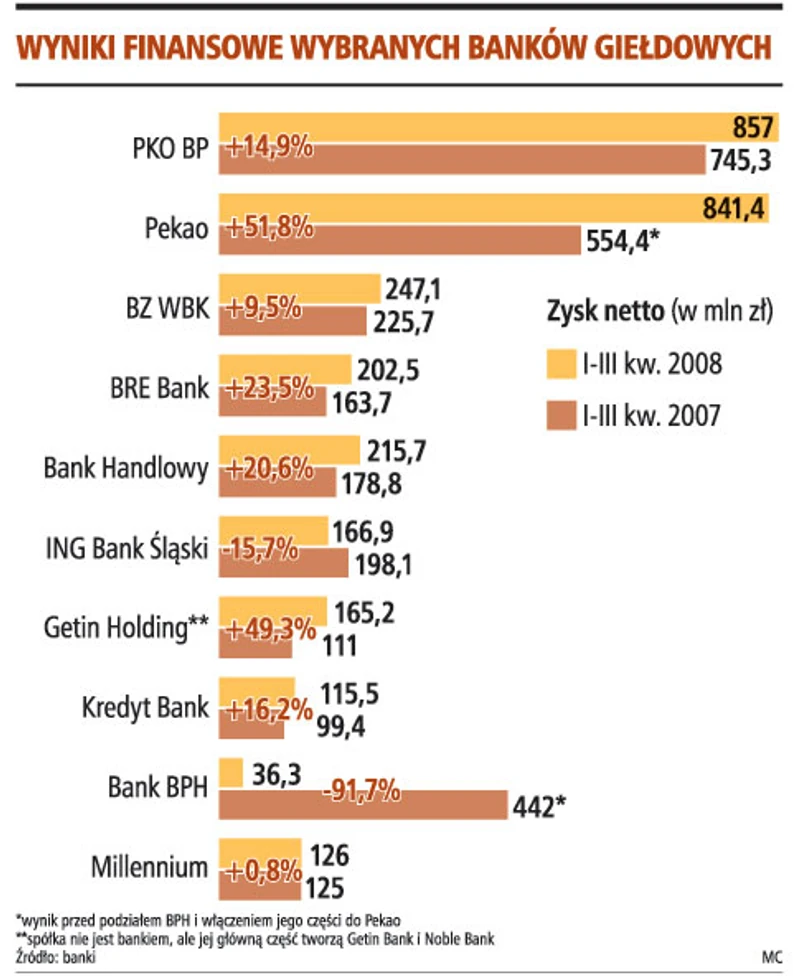 Dziesięć największych banków giełdowych (wprawdzie Genin Holding bankiem nie jest, ale jego głównymi częściami są Getin Bank i Noble Bank) zarobiło łącznie w III kwartale br. 2,97 mld zł, czyli o 4 proc. więcej niż w analogicznym okresie 2007 roku. W liczbach bezwzględnych to najlepszy kwartał w historii sektora bankowego. Wiele banków, np. PKO BP, Pekao czy BRE zanotowało rekordowe zyski kwartalne. Jeśli jednak chodzi o tempo wzrostu wyniku całego sektora, nie jest już tak dobrze - jeszcze w dwóch pierwszych kwartałach tego roku zyski giełdowych banków rosły w tempie dwucyfrowym.