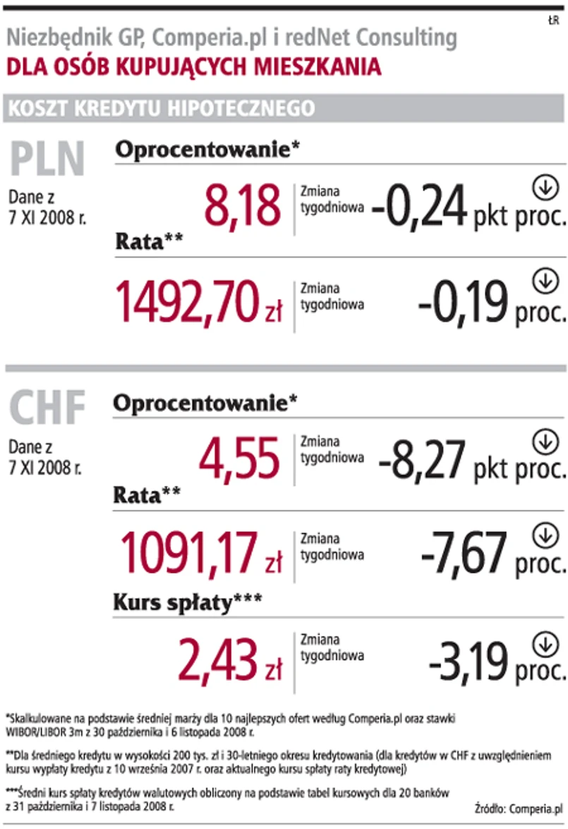 Na koniec ubiegłego tygodnia - wyliczona przez Comperię - rata przykładowego kredytu hipotecznego w złotych zmniejszyła się o taką samą kwotę jak w tygodniu wcześniejszym - dokładnie o 2,81 zł. Rata wynosi więc 1492,70 zł, a oprocentowanie spadło o 0,02 pkt proc.