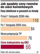 Prezes UKE Anna Streżyńska chce, by minuta rozmowy z sieci TP do sieci komórkowych Era, Plus, Orange, Sami Swoi i Heyah kosztowała w szczycie w najpopularniejszych planach taryfowych - standardowy, darmowe wieczory i weekendy, tp 60 minut za darmo - nie więcej niż 66 gr, a poza szczytem, czyli wieczorami i w dni wolne od pracy, do 63 gr. Minuta rozmowy do sieci Play (operatorem jest P4) ma według UKE kosztować w szczycie nie więcej niż 1,04 zł. Dziś użytkownicy tych abonamentów za minutę rozmowy do sieci komórkowych płacą w szczycie 84 gr, a przed poprzednią obniżką z listopada 2006 roku było to 1,1 zł.