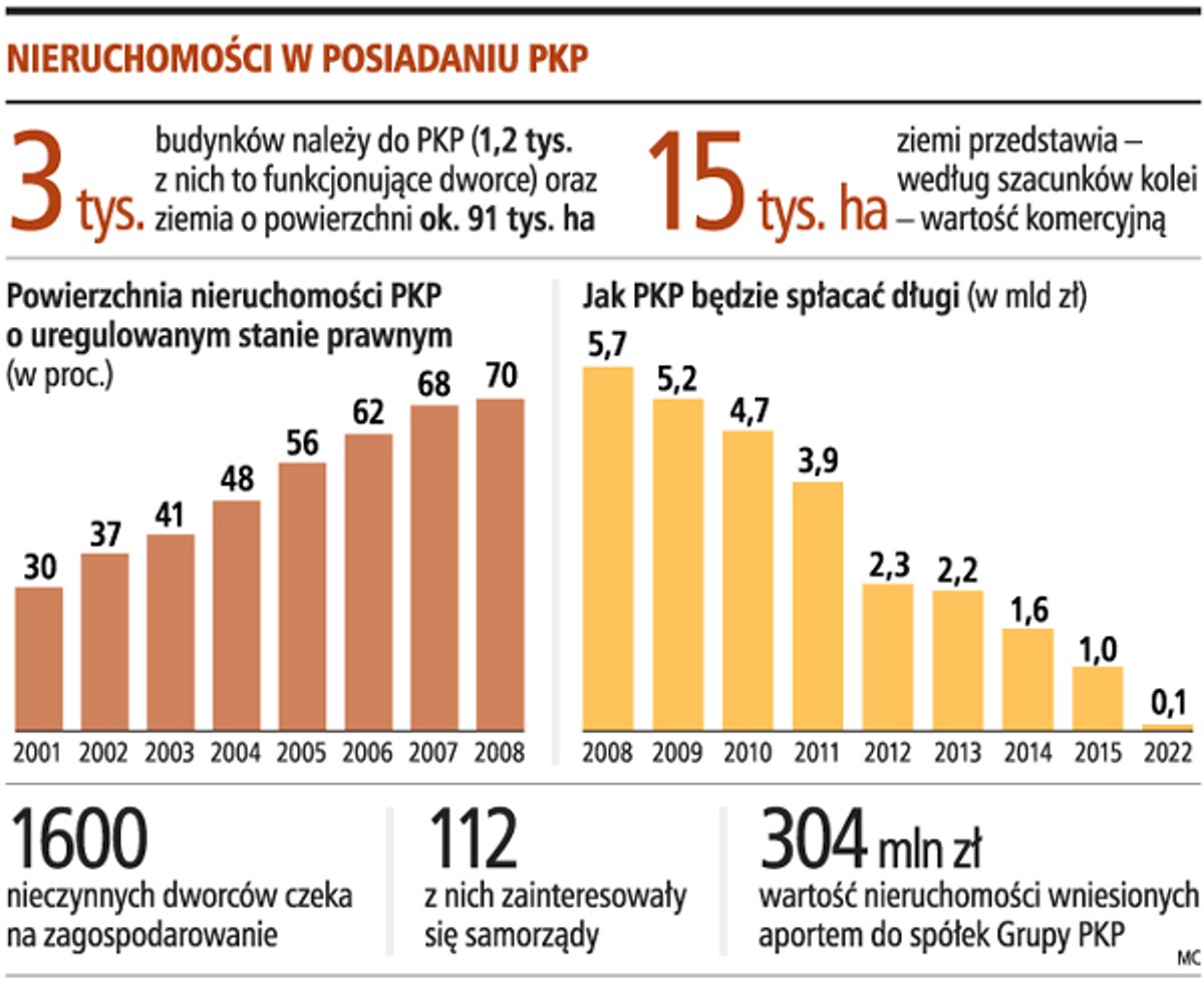 W 2009 roku kolej poszuka chętnych na atrakcyjne tereny w Warszawie, Gdańsku i Poznaniu. Do 2012 roku PKP chce ze sprzedaży gruntów uzyskać ponad 2 mld zł. Planowane przez kolejarzy wpływy może obniżyć zastój na rynku nieruchomości.