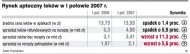 Pierwsze prognozy PharmaExpert zakładały większą dynamikę sprzedaży leków w tym roku. Jednak wydarzenia ostatnich miesięcy wyhamowały wzrost. W marcu weszła nowa lista leków refundowanych, która obniżyła ceny kilkuset preparatów. Później zakupy leków zmniejszyły się, bo strajkujący lekarze wypisywali mniej recept. W pierwszej połowie roku obroty ze sprzedaży leków wzrosły o 1,4 proc. - do 10,5 mld zł. Prawie 33 proc. obrotów aptek to sprzedaż preparatów bez recepty. Wyraźnie widać, że nie mogąc liczyć na wskazanie lekarza, pacjenci sięgali po nie w aptekach częściej niż o tej porze w 2006 roku.