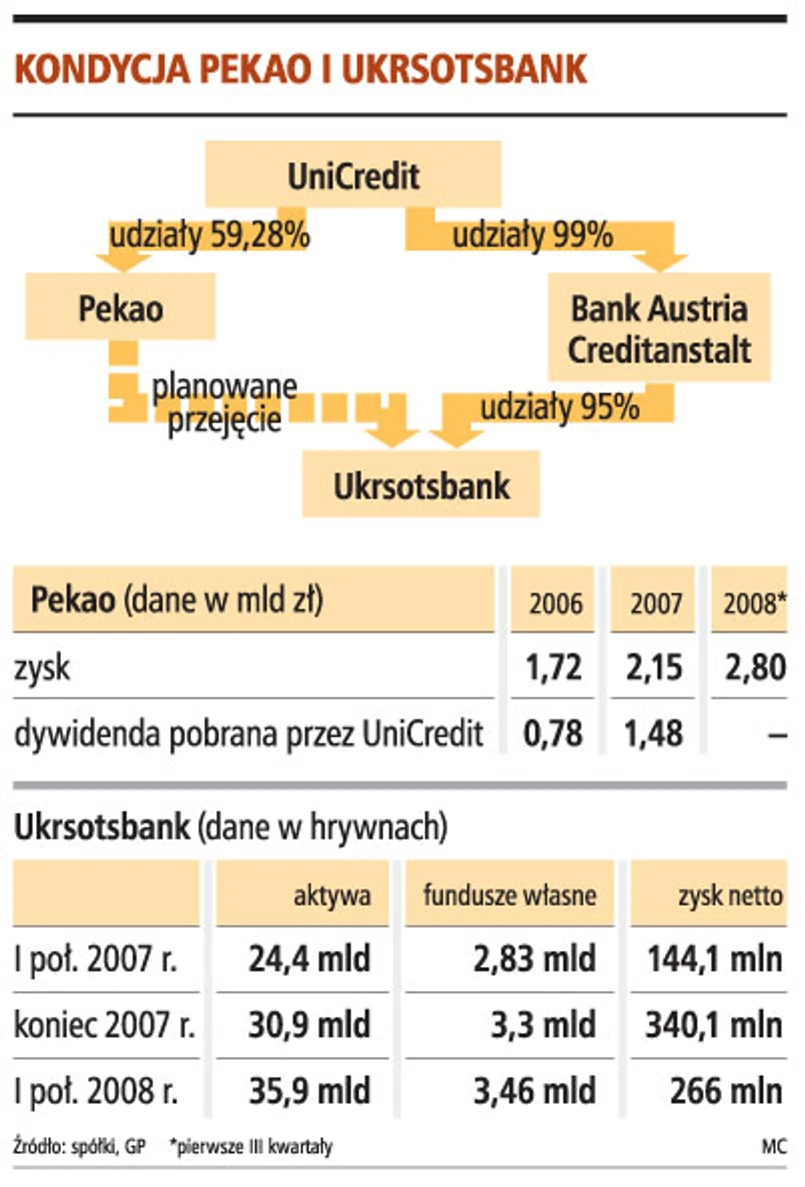 Jak dowiedziała się GP, UniCredit, główny akcjonariusz Pekao, chce, by polski bank przejął wkrótce 95-proc. pakiet akcji Ukrsotsbanku z Kijowa. W 2007 roku za 1,52 mld euro ten ukraiński bank kupił wchodzący w skład włoskiej grupy Bank Austria Creditanstalt (BACA).