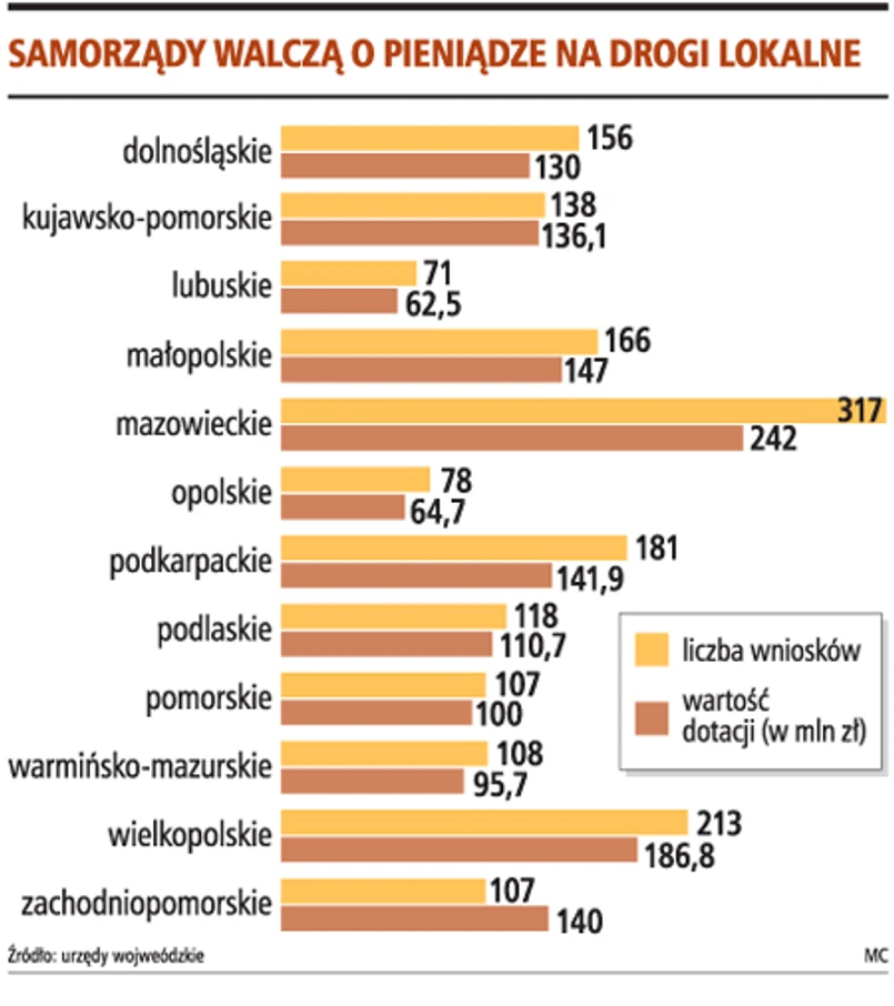 Z sondy, którą przeprowadziła GP, wynika, że liczba wniosków w dwunastu województwach, które odpowiedziały na nasze pytania, przekroczyła 1,6 tys. Powiaty i gminy ubiegają się w nich o ponad 1,4 mld zł. To więcej o 400 mln zł, niż rząd chce przeznaczyć na ten cel. Tymczasem liczby będą jeszcze większe, ponieważ w naszych statystykach nie zostały uwzględnione województwa: lubelskie, łódzkie, śląskie, świętokrzyskie.
