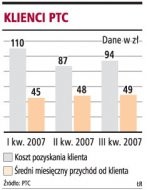 EBITDA PTC (zysk operacyjny powiększony o amortyzację) w III kwartale był na poziomie 35,1 proc. przychodów, wobec 34,6 proc. w II kwartale i 32,9 proc. w I kwartale. Po trzech kwartałach wyniósł 1,882 mld zł. Firma zapowiada poprawę w IV kwartale, ale jej szef - Klaus Hartmann - nie chciał wczoraj potwierdzić, czy PTC będzie na koniec roku miała 13 mln klientów.