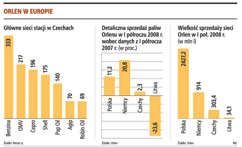 Budowa stacji własnych, a przede wszystkim rozwój oferty franczyzowej to priorytety w działalności Polskiego Koncernu Naftowego Orlen na czeskim rynku. Orlen zrezygnował z kupna lokalnych sieci stacji Pap Oil (140 obiektów) i Robin Oil (69), nie wyklucza to jednak akwizycji większych graczy na tym rynku, w tym 196 stacji EuroOil. Inwestycja ta jest o tyle trudna, że sieć jest dystrybutorem państwowej firmy Cepro, a czeskie Ministerstwo Finansów na razie nie planuje prywatyzacji przedsiębiorstwa. Większe szanse PKN ma na przejęcie czwartej pod względem wielkości sieci w tym kraju. Chodzi o aktywa koncernu Shell.
