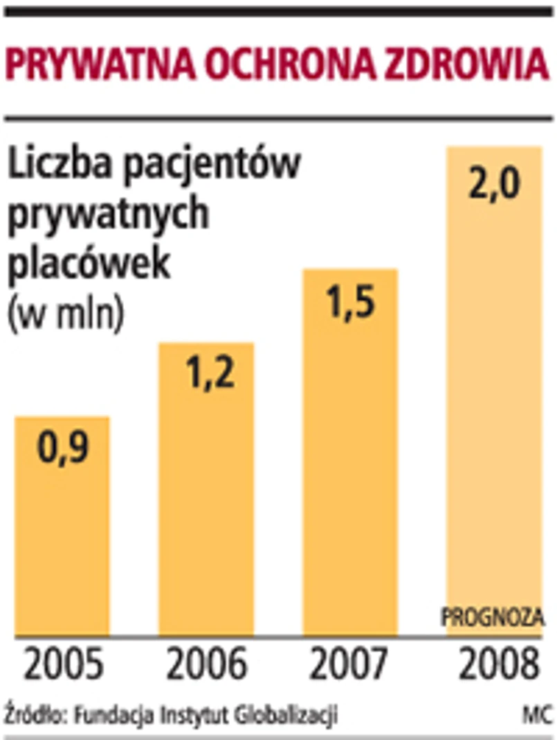 Według ostrożnych szacunków w 2007 roku z usług prywatnych klinik skorzystało ponad 1,5 mln pacjentów. W tym roku oblicza się, że może ich już być blisko 2 mln. Instytut Globalizacji, który opracował raport na temat rynku prywatnych usług medycznych, szacuje, że udział prywatnych szpitali w rynku, liczonym liczbą hospitalizacji, może w 2009 roku przekroczyć 10 proc. Kilka lat temu wskaźnik nie przekraczał 1 proc. To oznacza, że prywatne kliniki notują znaczny wzrost wpływów.